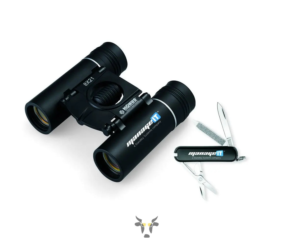 Our bestselling gift set with a Swiss army knife & binoculars! Swiss army knife includes blade, screwdrivers, scissors and more. The compact binoculars has a wide field with a view of 1000 yards, also included in a soft-sided case with Velcro closure.