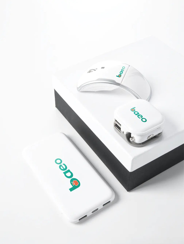 Power packed gift set with powerbank, mouse, and charger in a packaged in a deluxe gift box.
